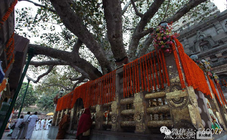 寺背后即是著名的菩提树,枝繁叶茂,根盘交错,绿荫密布,形成了巨大的伞盖,几乎能把摩诃菩提寺后半部遮掩不见。据说佛陀即在此树下得道成佛,故受到佛教徒敬仰,其枝也曾多次被折,代表佛陀送往世界各地的佛寺供养,繁衍滋生。现树下立有红砂石板“金刚座”,以指示佛陀成逍处和表示佛的智慧,由4根柱子搭成的布幔覆盖,篷内堆满了信徒的鲜花供品。目前这颗树是1870年重建时,从斯里兰卡移植过来的。中国晋代高僧法显和唐代高僧玄奘都曾到过这里。玄奘在《大唐西域记》内写道:“昔佛在世,高数百尺,屡经残伐,犹高四五丈,佛坐其下成等正觉,因而谓之菩提树焉”。