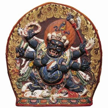 Brought to Tibet by Khyungpo Naljor the founder of the Shangpa Kagyu School, this form of Mahakala became popular in the Sakya, Kagyu and Jonang traditions and was later adopted into the Gelugpa School, becoming the principal protector.